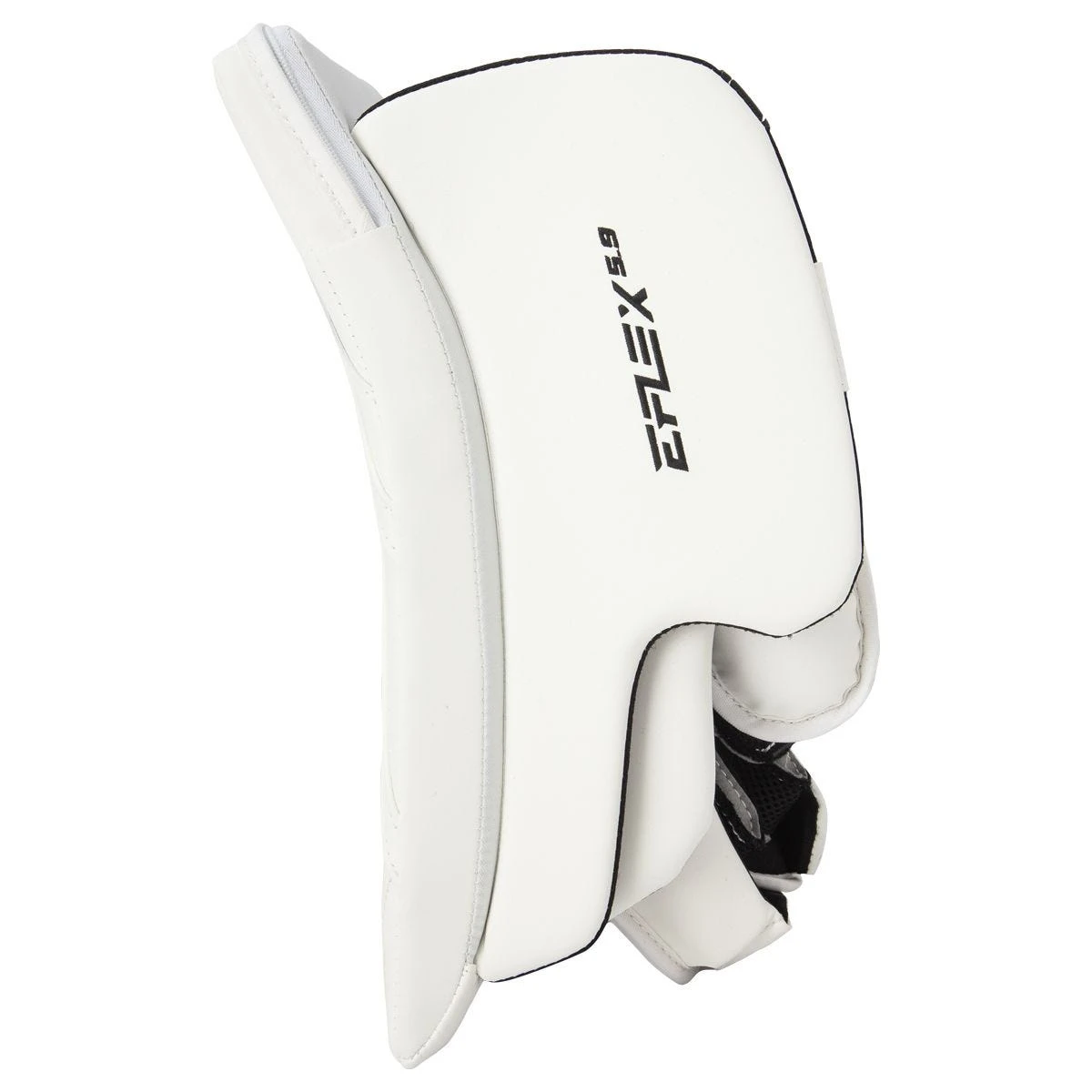 Next, a straight finger protector has been continued on from the E4.9 line which covers more of the opening where the stick sits on the sidewall while giving more mobility when holding a stick. Flipping around, an all-new adjustable flex motion cuff designed to have amplified mobility with customizable fit has been implemented to give the goaltender a wider range of motion for the ease of blocker saves. Moving on to the base of the fingertips, you will see the two flaps that sit over top of the fingers for extra protection from specific situations like a puck riding up the goalies stick.
