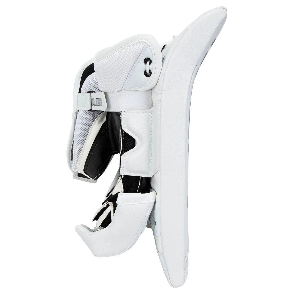 Starting at the front of the blocker, an extra stiff high density foam insert with composite reinforcement makes for an incredibly stiff blocker and better puck deflection. The front surface is secured to the blocker with laces to allow for more precise puck control. The angled top section allows for better control on puck deflections.